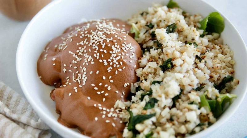 We made a mole sauce with Mexican spices, creamy nut butters and our Chocolate Weight Loss Packets and blended it with sauteed veggies and chicken broth for the ultimate comfort meal. Served along cauliflower rice, this is soon to be one of your favorite low carb meals!