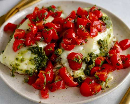 This chicken dish is bursting with flavor from homemade pesto and cherry tomato salad, and delicious creaminess from mozzarella cheese. The olive oil in the marinade and pesto adds healthy fats to this super satisfying meal.