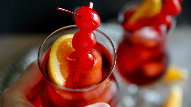 Pour in each glass and garnish with fresh orange slices and maraschino cherries.