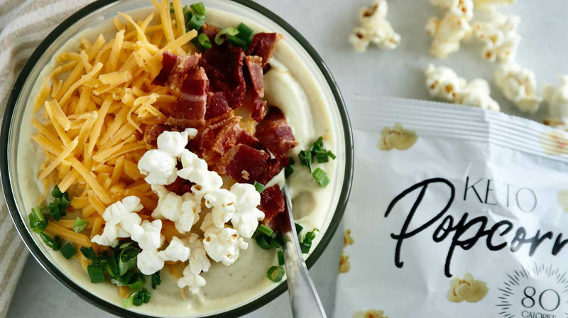 Serve between 4, garnishing with Real Ketones Keto Cheddar Popcorn, bacon, shredded cheddar cheese and scallion and store any leftovers in the fridge for up to 3 days. You can also freeze this soup in a sealed plastic bag (garnishing when ready to serve) or container for up to 6 months.