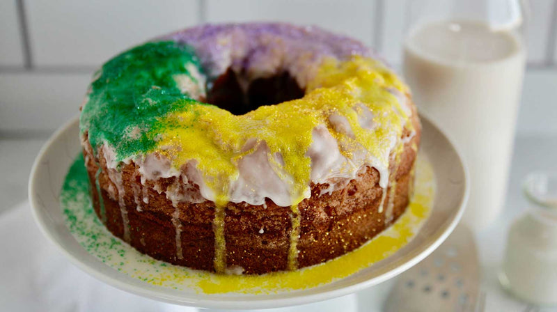 King Cake is a New Orleans cinnamon Bundt cake originating in France. It’s three colors—yellow, green and purple, are symbolic of the three wise kings who visited baby Jesus at his birth. Traditionally, a toy baby is baked into the cake and whoever finds the baby in their slice is considered “king for the day”!